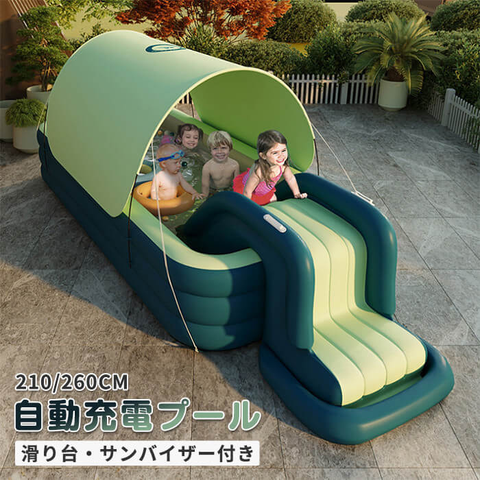 【サイズ】 210cm三層 : 外寸:210*145*60cm 内寸: 155*98*58cm(適用人数:1~4) サンバイザー:210*140*140cm 滑り台:185*90*94cm プール底:厚めのEPE 充気時間:1-3分 260cm三層 : 外寸:260*170*60cm 内寸: 216*125*58cm(適用人数:1~6) サンバイザー:260*165*130cm 滑り台:185*90*94cm プール底:厚めのEPE 充気時間:3-6分 【自動膨張エアープール】 2021新番の自動膨張エアープールはコードレスポンプ付き、ワンタッチボタンで迅速的に膨張できます。