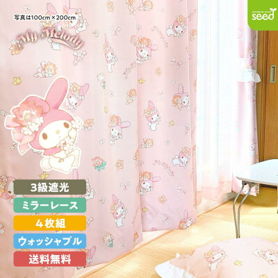 100×185cm(4枚組) サンリオ マイメロディ (ウォーターペイント) 3級 遮光カーテン と ミラーレース カーテン 4枚セット [ Mymelody キャラクター 大人 かわいい 掃き出し窓 おしゃれ] あす楽