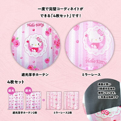 100×200cm(4枚組) サンリオ ハローキティ(ふわもこキティ) 3級 遮光カーテン と ミラーレース カーテン 4枚セット [ キャラクター 大人 フワモコ 4枚入り バラ ローズ ハート ばら 薔薇 ピンク 子供 大窓 掃き出し窓 おしゃれ] あす楽