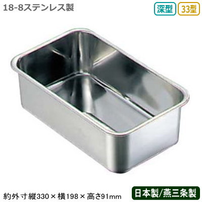 18-8ステンレス製深型長バットはこちら 18-8ステンレス製深型長バット用蓋はこちら 18-8ステンレス製深型長バット用アミはこちら 他の日本製・角バット・組バットはこちら 【商品仕様】 ●規格/33型 ●サイズ/約外寸縦330×横198×高さ91mm ●材質/18-8ステンレス ●日本製(新潟県燕三条) ※画像のバットは共通イメージですので、ご購入の際はサイズ、 仕様等をご確認下さい。