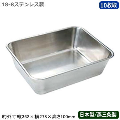 18-8ステンレス製 深深バットはこちら 18-8ステンレス製 野菜水切りバットはこちら 他の日本製・角バットはこちら 【商品仕様】 ●規格/10枚取 ●サイズ/約外寸縦362×横278×高さ100mm ●材質/18-8ステンレス ●日本製(新潟県燕三条) ※画像のバットは共通イメージですので、ご購入の際は サイズ、仕様等をご確認下さい。