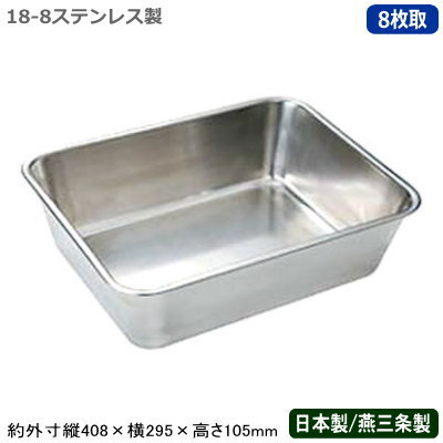 18-8ステンレス製 深深バットはこちら 18-8ステンレス製 野菜水切りバットはこちら 他の日本製・角バットはこちら 【商品仕様】 ●規格/8枚取 ●サイズ/約外寸縦408×横295×高さ105mm ●材質/18-8ステンレス ●日本製(新潟県燕三条) ※画像のバットは共通イメージですので、ご購入の際は サイズ、仕様等をご確認下さい。